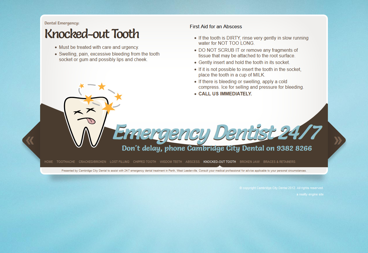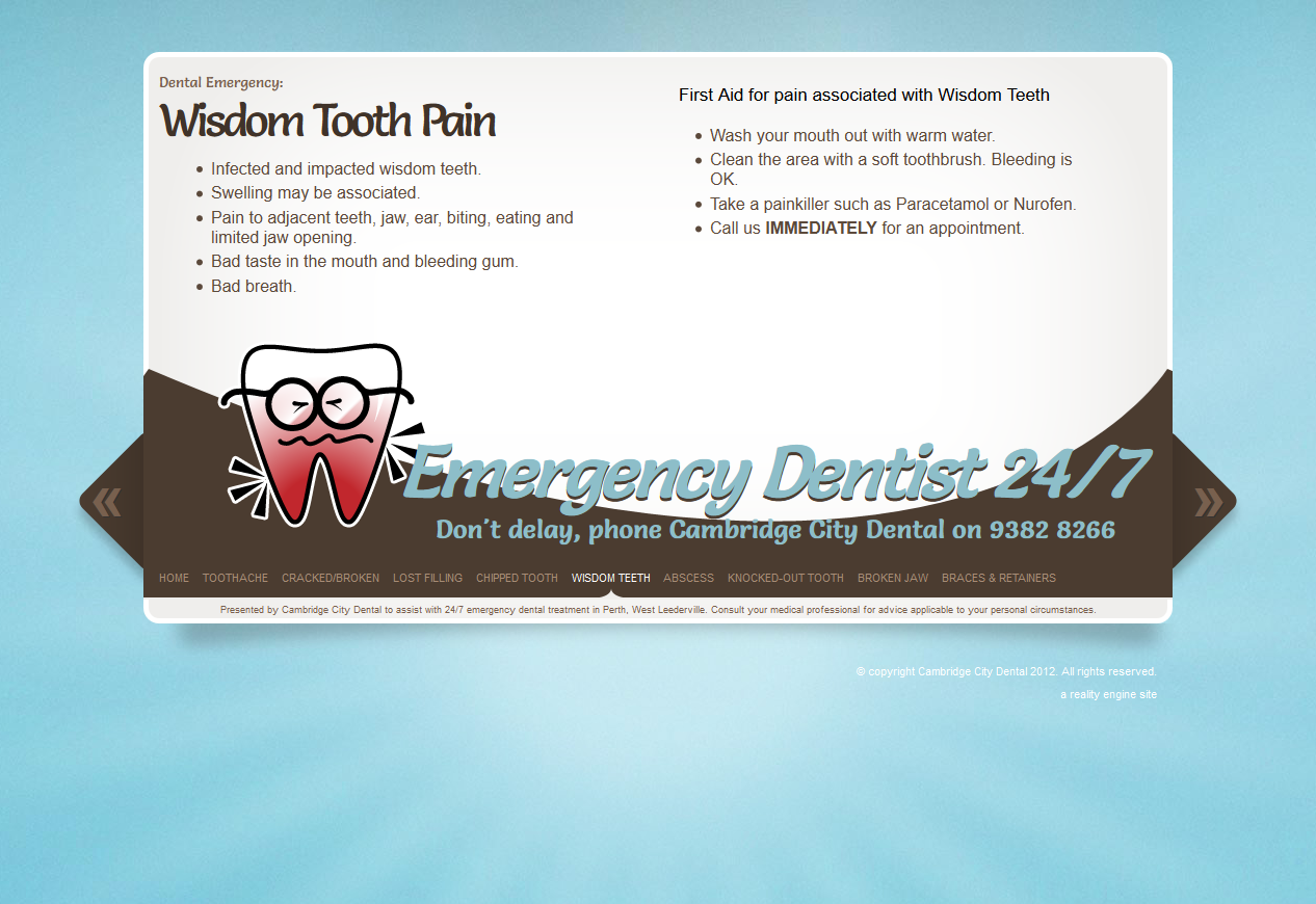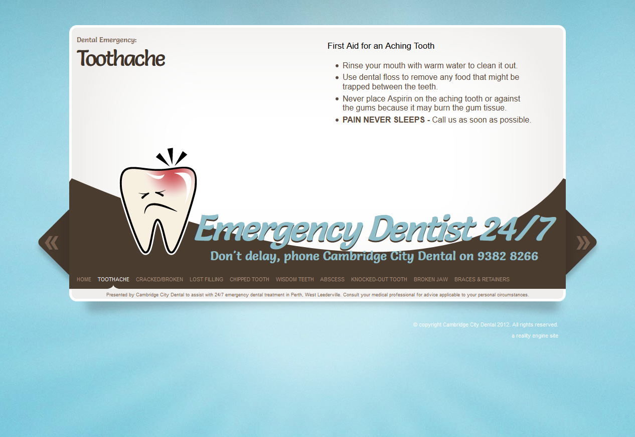 A microsite designed to serve as a secondary lead generator via organic search, EmergencyDentist247.com.au saw a simple and bold tooth character in dental pain of various forms created for a single page with a horizontal jQuery carousel.