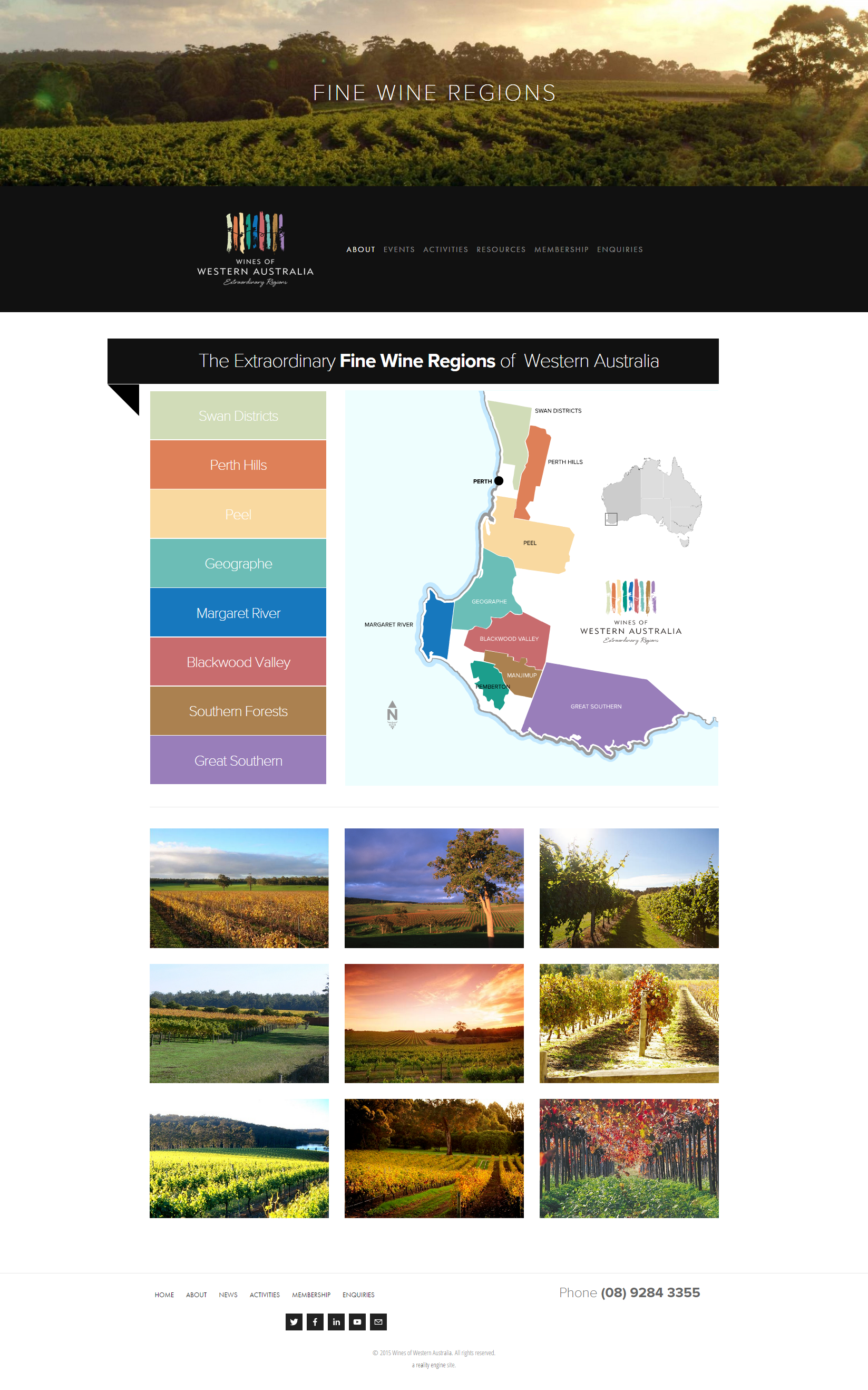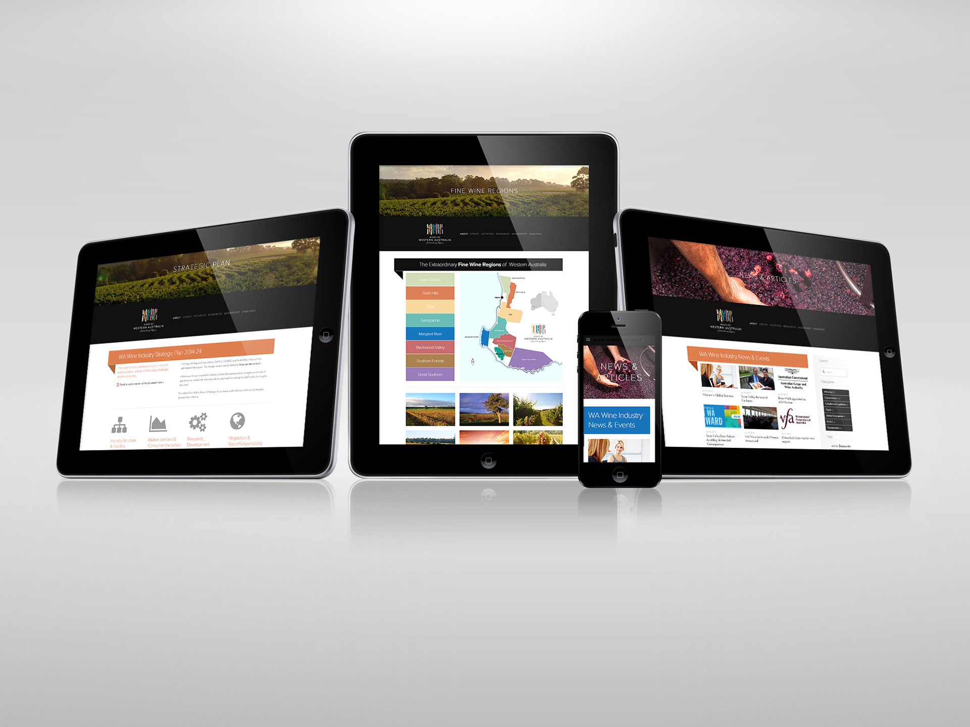 Website and information hub for Wines of WA, their new brand was applied across a responsive site featuring a news blog and events calendar which they maintain in-house.